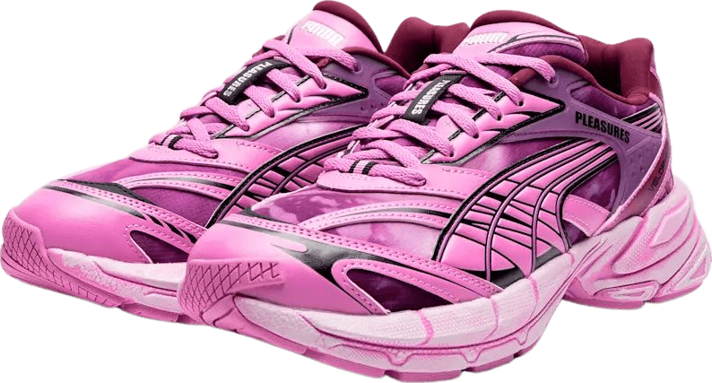 The first PUMA x PLEASURES collection is inspired by 00's aesthetics with a nod to our origins translated in graphics throughout the collection. The Velophasis silhouette is a 2000s hybrid, taking inspiration from our heritage performance running range.