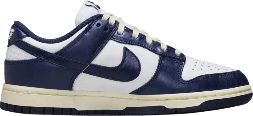 The Nike Dunk Low Vintage Navy (W) brings an aged aesthetic to the retro ‘80s hoops shoe, highlighted by a pre-yellowed rubber midsole. Cream-colored laces secure the upper, composed of smooth white leather on the quarter panel and perforated toe box. Contrasting hits of navy settle on the Swoosh, eyestay, and forefoot and heel overlay, all featuring a subtle sheen and a lightly textured finish. Atop the breathable nylon tongue, a woven tag displays classic Nike branding.