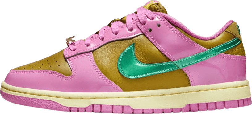 The Nike Dunk Low x Parris Goebel presents the acclaimed choreographer’s colorful take on the classic Dunk silhouette. The low-top sports a leather upper in Bronzine, contrasted by pink patent leather on the forefoot and heel overlay. In addition to an iridescent emerald Swoosh, branding hits include gilded Swoosh dubrae and upside-down Nike logos on the tongue tag and heel tab. A vintage finish is applied to the midsole, supported underfoot by a durable pink rubber outsole.