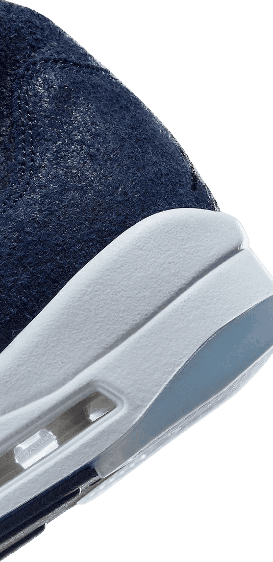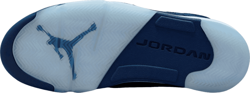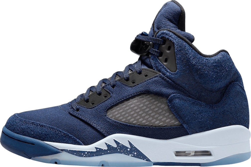 The Air Jordan 5 Midnight Navy showcases a tonal finish on the textile and suede upper, equipped with a padded collar and breathable quarter panel netting. Molded black eyelets match the Jumpman logos that decorate the tongue and back heel. The sneaker rides on a white polyurethane midsole with speckled shark-tooth detailing and a visible Air-sole unit in the heel. Underfoot, a blue-tinted translucent rubber outsole features a herringbone traction pattern for optimal grip.