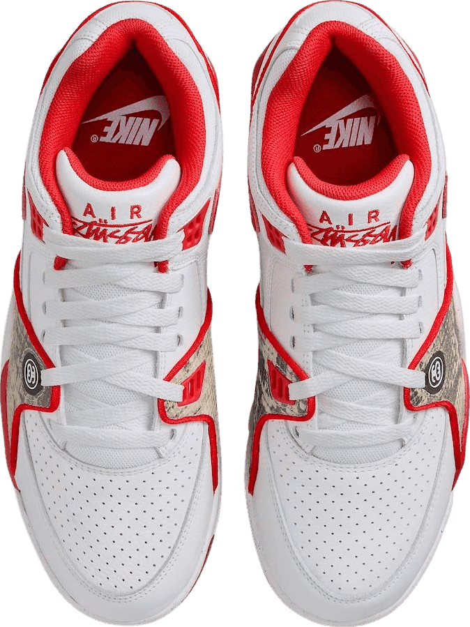 The Nike Air Flight 89 Low Stussy Habanero Red celebrates the 35th anniversary of the retro hoops shoe. Smooth white leather is utilized on the upper, accented with contrasting hits of crimson on the molded eyelets, signature Swoosh and textile collar lining. ‘Air Stussy’ is embroidered on the tongue, while Stussy’s Double S logo badge adorns a lateral-side forefoot overlay in faux snakeskin. Traditional Nike Air branding decorates the back heel. The sneaker rides atop a two-tone polyurethane midsole with a visible Air-sole unit nestled in the heel.