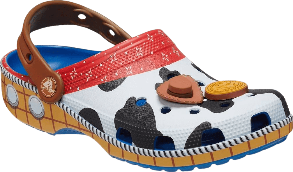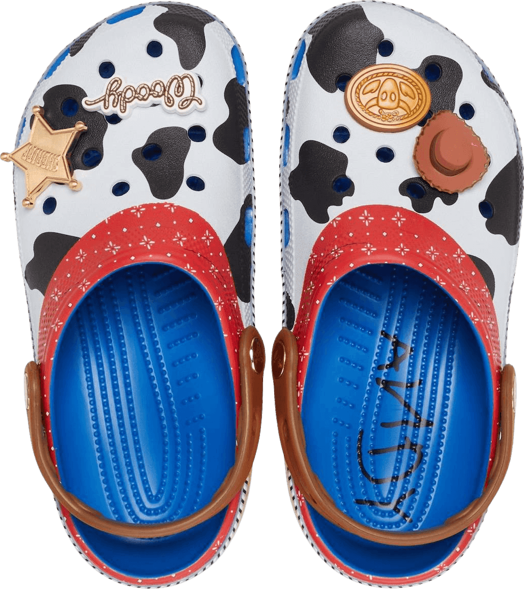 Shake out the snake in your boot, Sheriff Woody makes his debut as a Classic Clog! This exclusive design features a wrapped print reminiscent of Woody’s iconic plaid shirt and cow print vest, topped with four exclusive Jibbitz™ charms. These clogs also feature the beloved “Andy” signature on the inside sole.