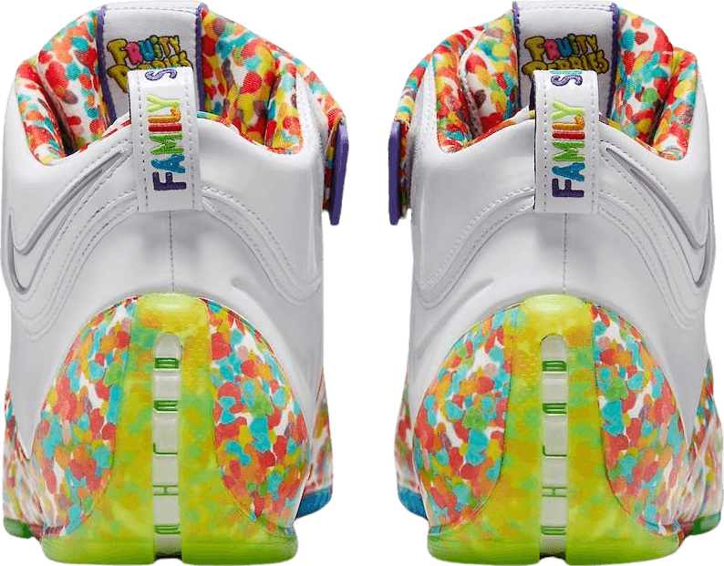 Inspired by LeBron's favorite childhood cereal, the LeBron 4 Fruity PEBBLES™ hits the shelves with a vibrant mix of nostalgic graphics. Reviving the King's coveted 2006 player exclusive, the original color scheme combines a White Foamposite upper that's colder than a splash of milk. Breakfast time is when families come together, so we added "FAMILY SIZE" to the pull tabs as a way to honor loved ones at your table. Time to get out of bed, open your Fruity PEBBLES™ shoebox and nourish your feet—all while attacking the day like LeBron.